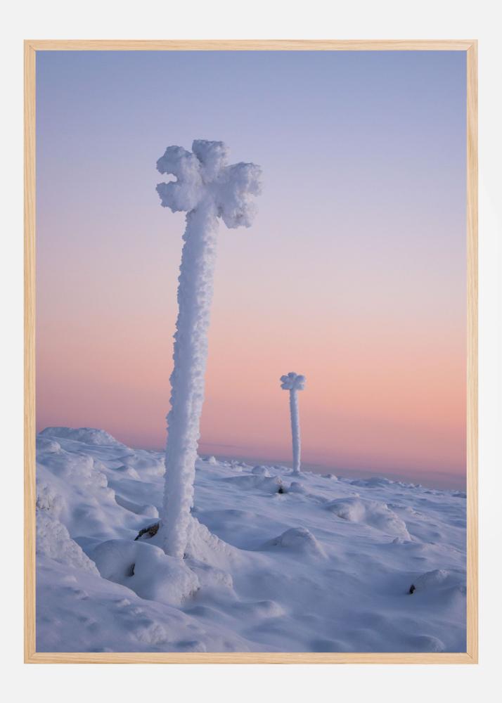 Denne plakat viser et drømmende vinterlandskab, hvor snedækkede formationer rejser sig fra et blødt, bølgende snelag. Motivet udstråler ro og minimalisme, med frostklædte søjler, der næsten ligner skulpturer i naturen. Himlen har en smuk farveovergang, som giver billedet et roligt og poetisk udtryk – perfekt som print eller plakat til dig, der ønsker at skabe en harmonisk og moderne stemning i hjemmet.